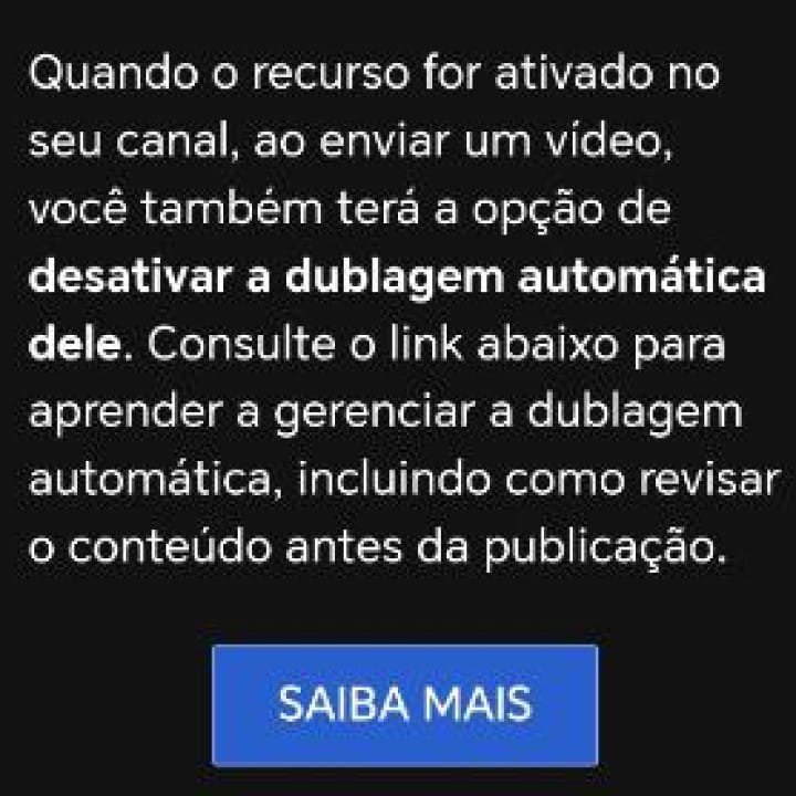 Ao enviar um vídeo para o YouTube, o criador de conteúdo visualizará a opção “desativar a dublagem automática”. Note que somente novos vídeos terão a dublagem para outras línguas inicialmente, ou seja, publicações mais antigas irão ficar sem a funcionalidade por enquanto.