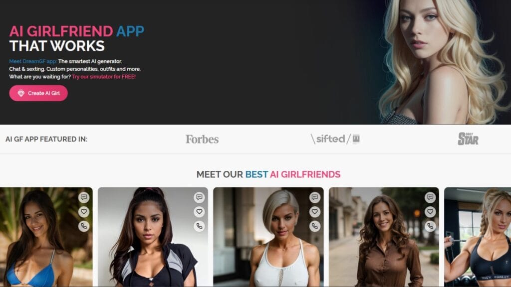 DreamGF é uma inteligência artificial desenvolvida para criar uma namorada virtual de forma personalizada, permitindo a geração de uma imagem e de um chatbot de IA para interação. É possível selecionar diversas opções para definir a aparência física, incluindo a cor do cabelo, o tipo de corpo, a etnia, dentre outras