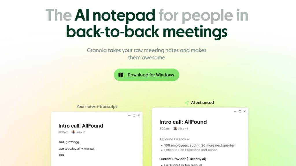 Granola é uma inteligência artificial desenvolvida para auxiliar nas anotações em reuniões, transcrevendo o áudio, resumindo anotações brutas e gerando resumos claros e concisos. Esta ferramenta de IA é compatível com outras plataformas e permite que o usuário crie notas de reunião em formatos personalizados para atender às diferentes necessidades que existirem.